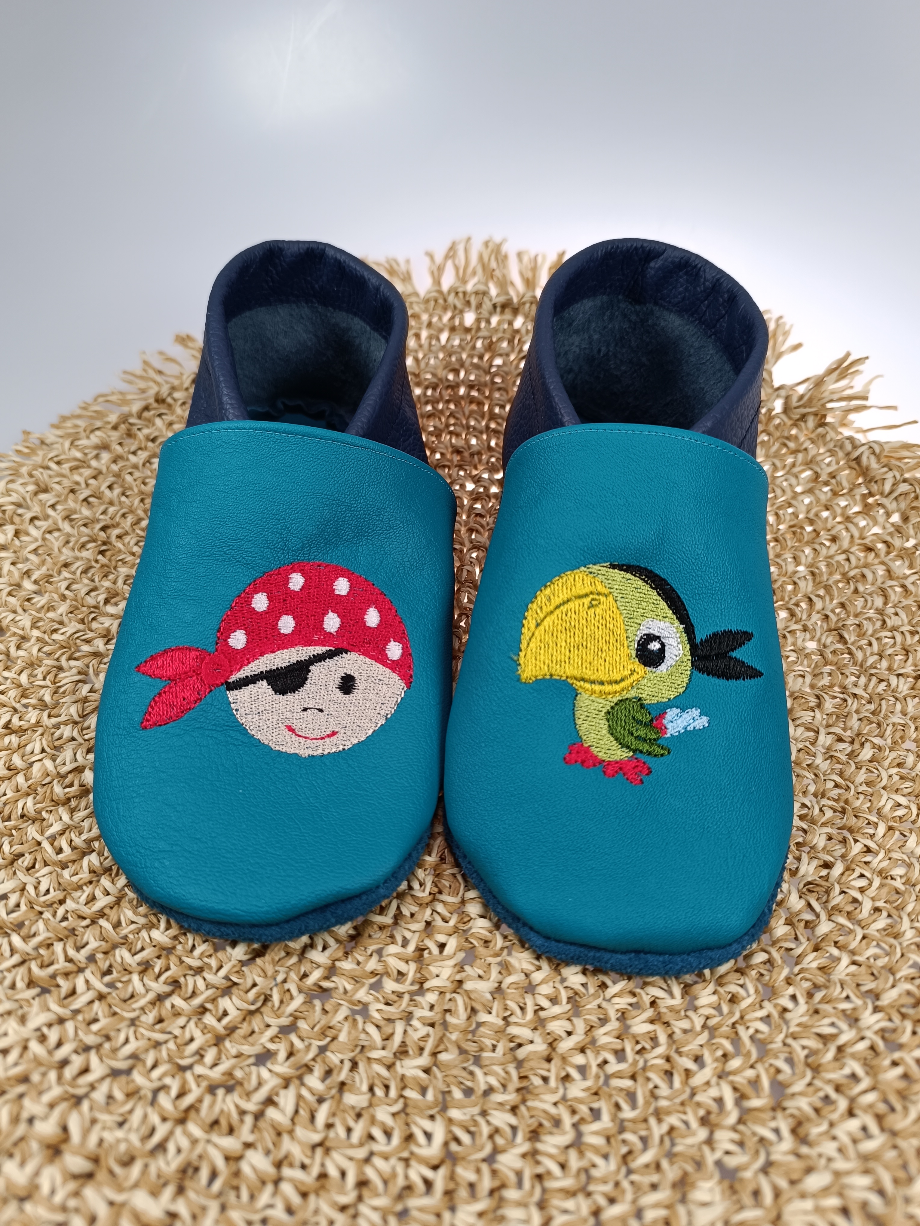 Lederpuschen Pirat/Papagei gestickt