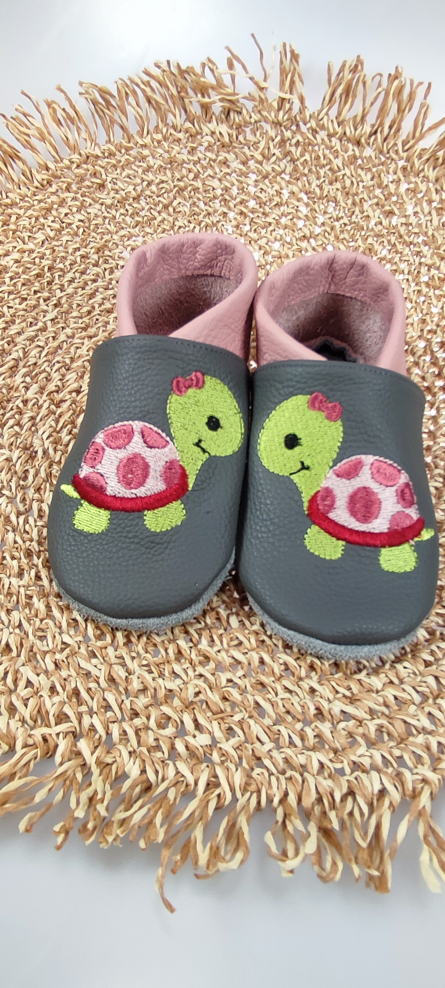 Lederpuschen Schilkröte mit Schleife gestickt